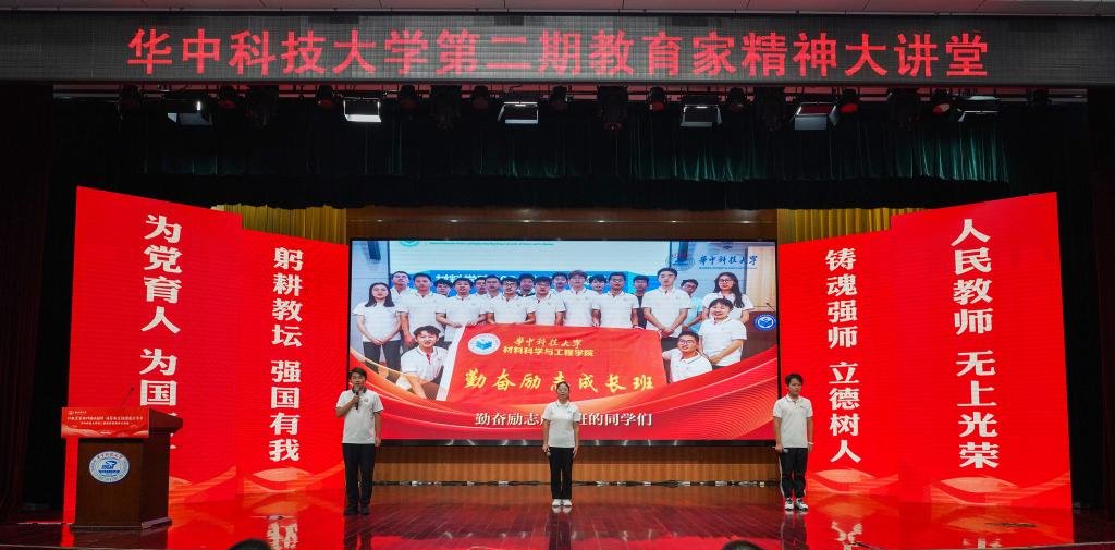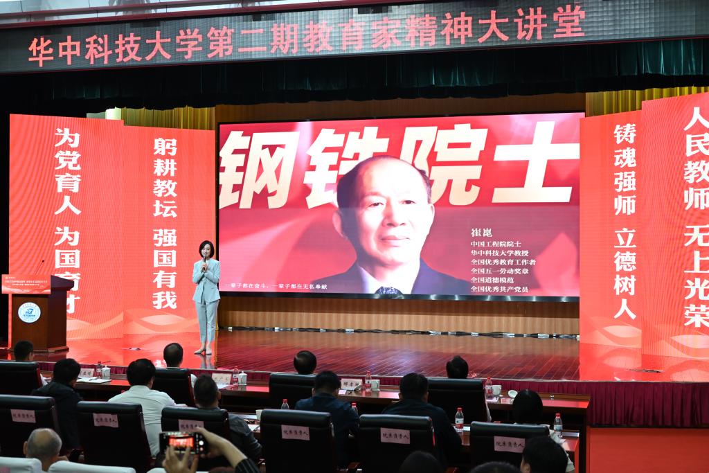 宣讲现场,学院三位教授从“科技报国·千锤百炼铸重器”“立德树人·培育英才锻钢典”“大爱无疆·初心如磐映赤诚”三个篇章展现了崔崑院士的动人事迹。肖建中教授回顾了崔崑院士烽火求学、攻坚国家急需模具钢、首将 Nb 元素用于模具钢的创新之路;肖建中教授与潘杰教授以对话方式分享崔崑院士手写教案、耄耋之年学电脑,耗时 7 年著成钢铁巨著《钢的成分组织与性能》的育人故事;胡树兵教授介绍崔崑院士捐资超千万设助学金、交百万特殊党费却生活俭朴的奉献之举。活动还包括“勤奋励志助学金”受助学生代表分享成长感悟以及由新闻与信息传播学院排演的朗诵剧《您是一块千锤百炼的特殊钢》。崔崑院士 在寄语视频中表示,实干是华科大人一以贯之的优良传统,希望广大教师继续弘扬实干作风,始终胸怀“报国”之志、永葆“勤奋”之心,积极投身学校建设与发展事业,为推动社会进步贡献智慧与力量。观众席自发响起的阵阵掌声,既是对崔崑院士作为教育家“为党育人、为国育才、无私奉献、甘为人梯”精神的高度共鸣,更是广大师生对践行职责使命发自内心的再确认。
