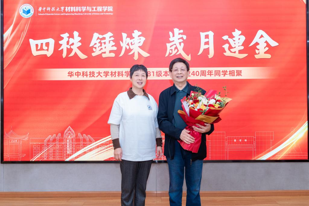 原材料学院党委书记郑恩焰老师回顾了40年前为81级校友发放单位派遣证的场景,感慨时光变迁,肯定校友们在各自岗位上为国家发展作出的贡献,鼓励大家不忘初心,继续砥砺前行。在郑老师发言前,校友代表为他献上鲜花,表达对恩师四十年如一日关怀的感激之情。