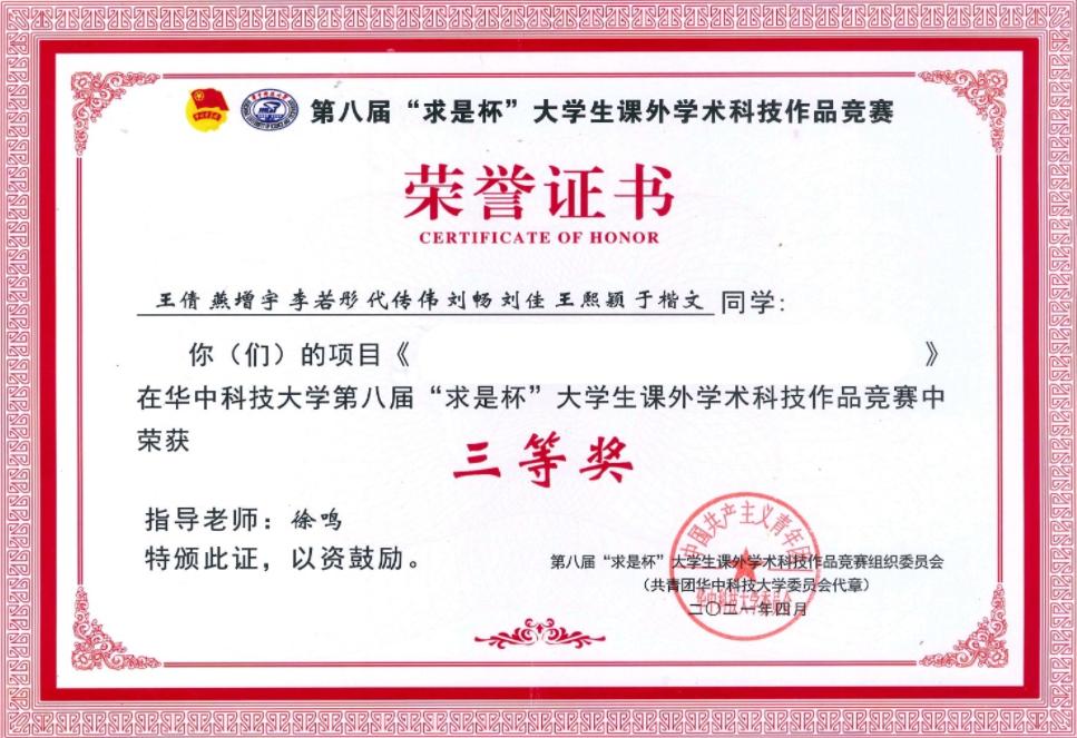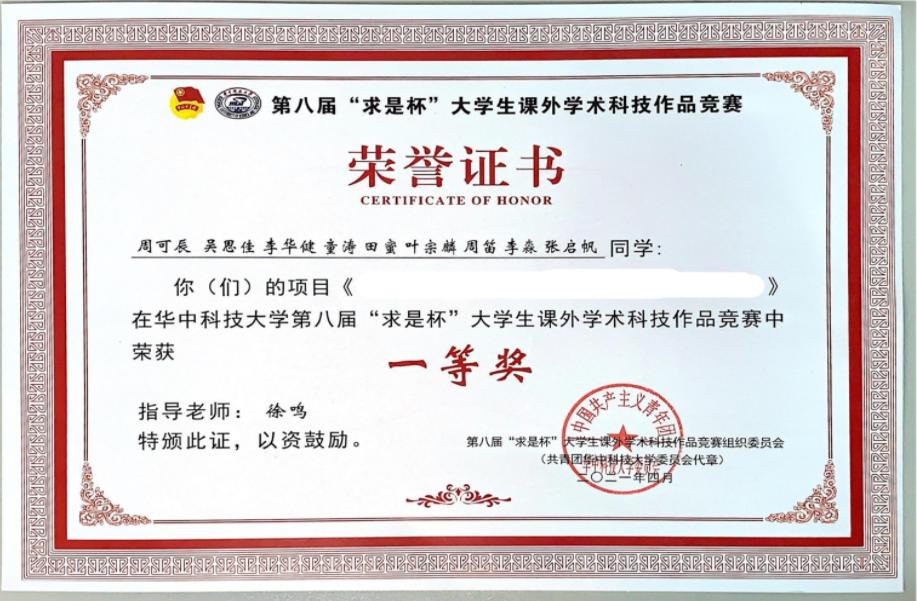 近日,在课题组组长徐鸣教授的带领下,课题组选派的以周可辰博士为首的队伍获第十七届“挑战杯”全国大学生系列科技学术竞赛校级一等奖。