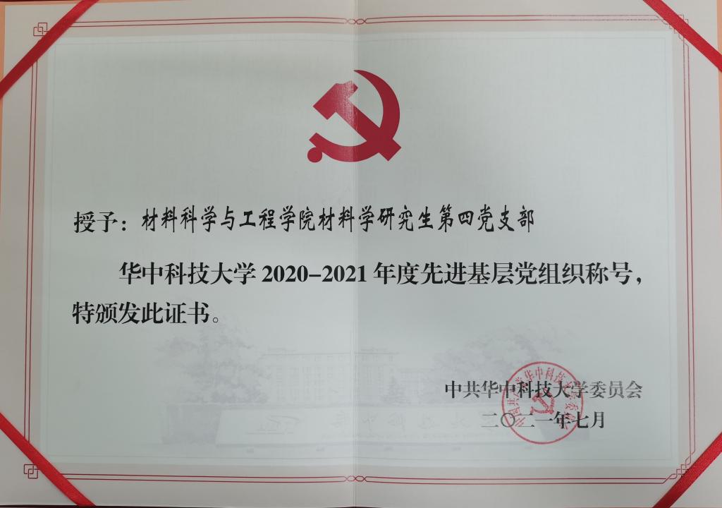 材料学第四党支部以建立、建成学习型党支部为目标,坚定落实“三会一课”制度,创新党组织生活会开展形式,以“光文化”建设为主线,开展了一系列支部特色活动。另外,支部成员在学习、科研、社会服务、体育等方面创先争优,先锋模范作用凸显。材料学第四党支部在2021年“七一”表彰中获评2020-2021年度先进基层党组织荣誉称号。