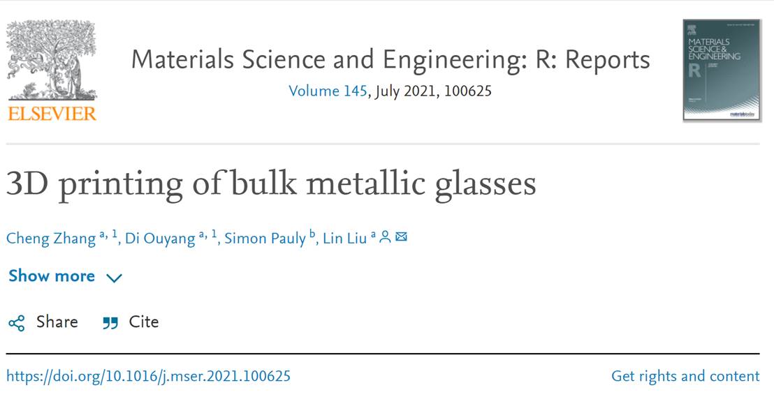 近日,国际材料领域顶级综述期刊《Materials Science andEngineering: R: Reports》发表了新金属材料研究中心柳林教授团队与德国University of Applied Sciences Aschaffenburg大学Simoon Pauly教授合作撰写的长篇综述论文“3D printing of bulk metallic glasses”。该杂志最新影响因子26.625,年发表论文数量仅30篇。