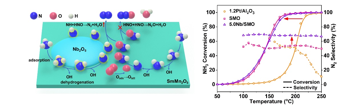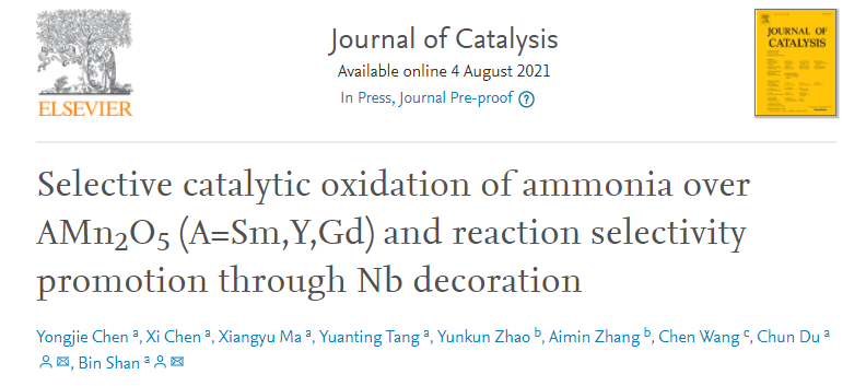 文章链接:Selective catalytic oxidation of ammonia over AMn2O5 (A=Sm,Y,Gd) and reaction selectivity promotion through Nb decoration