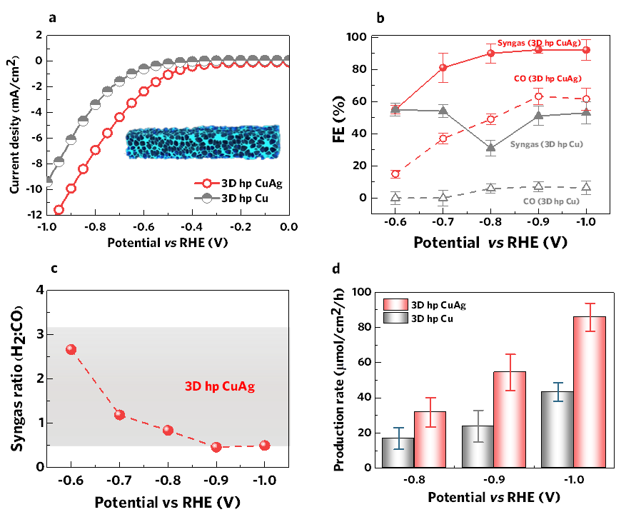 最近,新金属材料研究中心柳林教授团队张诚等人通过激光3D打印技术与电化学脱合金技术复合,成功制备了具有分级多孔结构的CuAg双金属,并系统研究了其电催化还原CO2生成合成气性能与机制。通过合理设计3D打印前驱体的合金成分,成功制备出3D分级多孔与纳米尺度相分离的CuAg双金属,实现了高的法拉第效率(>92%)以及宽的合成气可调比例(H2/CO从3:1到1:2)。进一步通过构筑分级孔结构,该3D分级多孔CuAg蜂窝催化剂的合成气产率进一步提高,达到140 μmol/cm2/h,超长的电化学稳定性140h(为目前合成气文献最高值)。此外,还发现3D分级多孔CuAg的催化性能显著优于3D分级多孔Cu以及2D分级多孔CuAg。研究发现:Ag的引入改变了Cu的能带结构,从而改善了反应动力学(Tafel斜率降低50%)并降低了电子转移电阻。而3D分级多孔CuAg的高稳定性与其跨尺度多孔结构有关,其中毫米孔促进了气泡的生长与解吸附,微米孔通过释放脱合金化中的应力使纳米多孔层与基体结合更稳定,纳米孔则极大地增加了催化剂的活性面积。本工作为开发高性能分级多孔电催化剂提供了新思路。