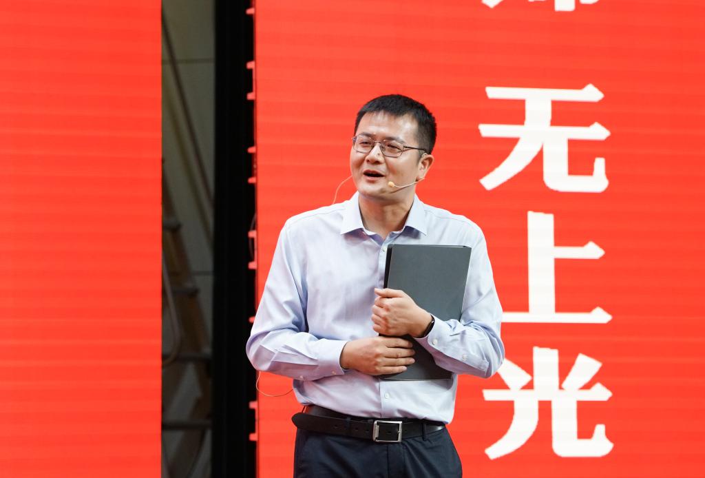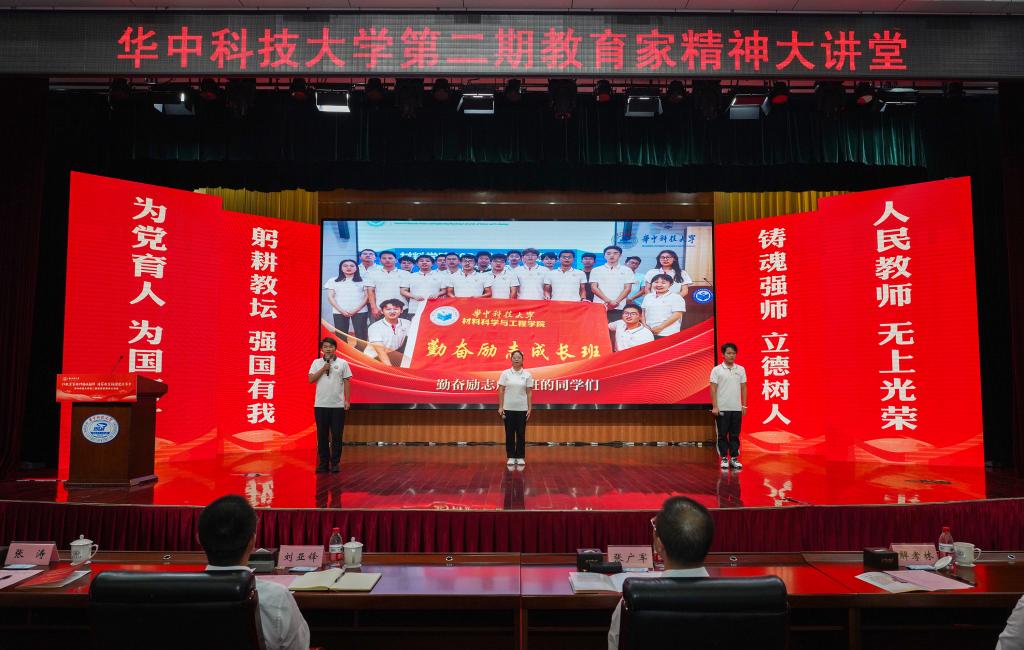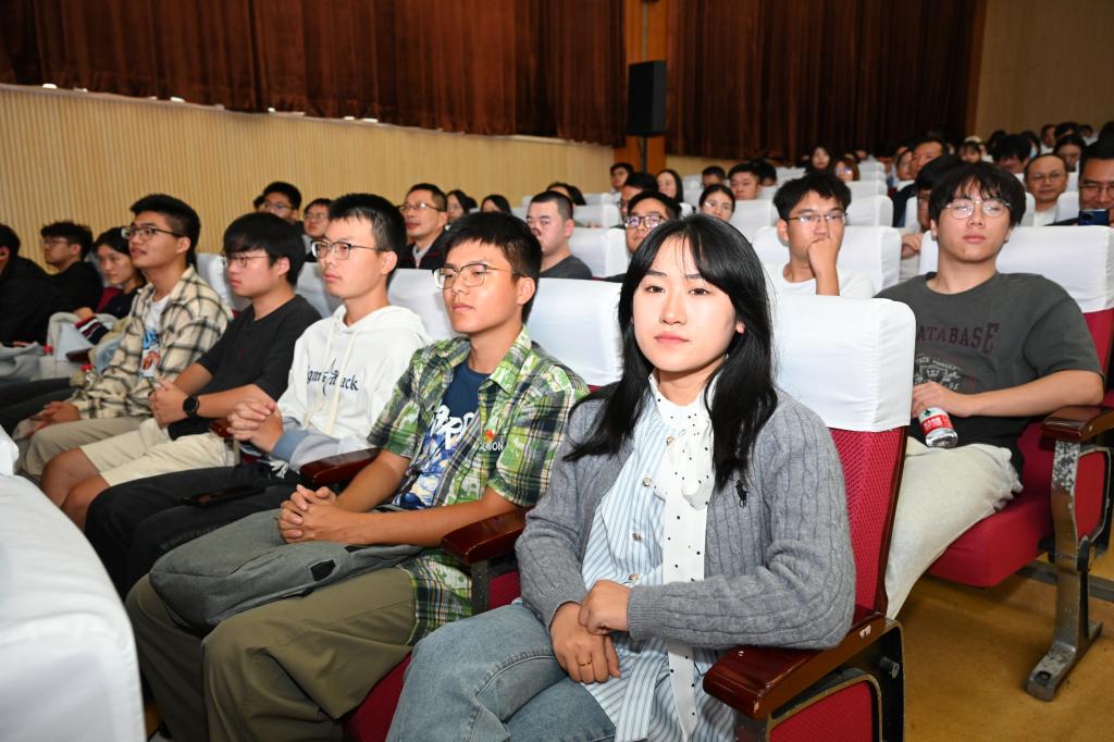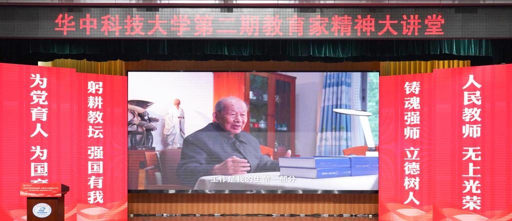 崔崑院士在寄语视频中表示,实干是华科大人一以贯之的优良传统,希望广大教师继续弘扬实干作风,始终胸怀“报国”之志、永葆“勤奋”之心,积极投身学校建设与发展事业,为推动社会进步贡献智慧与力量。现场观众认真聆听宣讲。