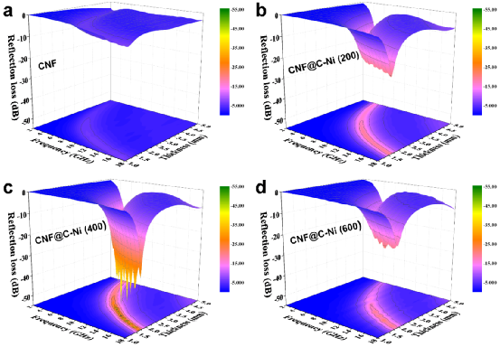 最近,半导体材料与器件研究中心的杨君友教授课题组通过在环氧树脂(EP)中构建新型三维CNF@C-Ni骨架,成功的制备了同时具备优异电磁波吸收和热管理性能的环氧树脂基电子封装材料。一方面,在填充量仅为5 wt % 的条件下,实现了环氧树脂热导率的大幅度提升,室温即可达到 0.5 Wm-1K-1。另一方面,赋予了环氧树脂基封装材料优异的电磁波吸收特性, 在 13.44 GHz 电磁波频率下,表现出 -49.77 dB 的最低反射损耗值以及为 5.44 GHz的最大有效带宽,满足了新型吸波材料“薄、轻、宽、强”的需求。