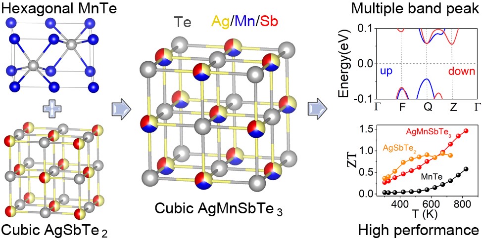 近日,华中科技大学杨君友教授(Junyou Yang)、罗裕波教授(Yubo Luo)与新加坡南洋理工大学颜清宇教授(Qingyu Yan)和美国西北大学Mercouri G. Kanatzidis教授研究团队合作,通过熵驱动实现了六方MnTe和立方AgSbTe2的化合,获得了立方结构的p型窄禁带AgMnSbTe3新型半导体热电材料。AgMnSbTe3具有岩盐矿NaCl晶体结构(其中 Ag、Mn、Sb共同占据Na节点位置)和多价带顶能带结构。该化合物具有优异的热电性能,热电优值ZT在823 K时为1.46,在400~773 K宽温域平均ZT值达0.87。该工作通过高熵设计合成了AgMnSbTe3新型化合物半导体热电材料,为热电材料的研究和开发提供了一种新思路,于近期发表在Journal of the American Chemical Society上。