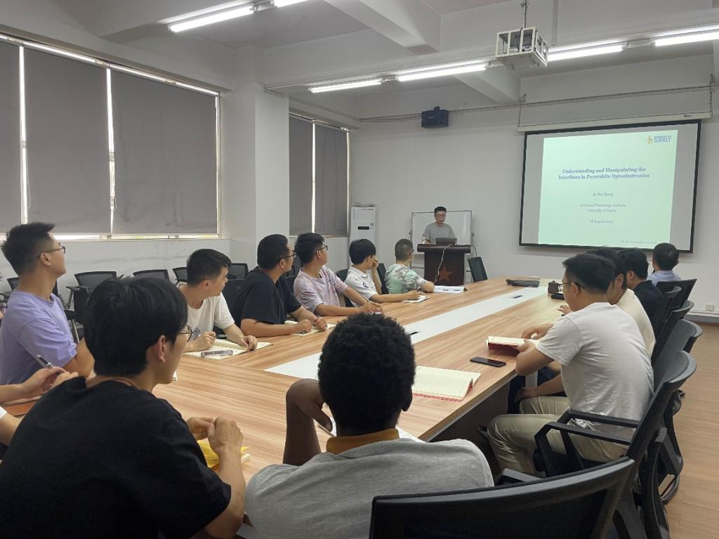 (通讯员 李鑫)2023年8月28日下午,受华中科技大学材料学院杨君友教授邀请,英国萨里大学张伟教授在国家防伪工程中心601做客第511期“杰出学者论坛”系列讲座。作了题目为“理解和操纵钙钛矿光电器件中的界面”的学术报告,材料学院罗裕波教授、李鑫副教授和湖北师范大学刘海强老师参加了本次座谈。本次讲坛由华中科技大学材料学院李鑫副教授主持。